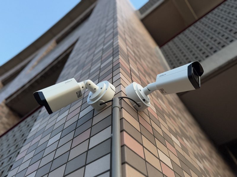 建物の角部分には、左右両方向をしっかりとカバーできるよう 2台のカメラを対向配置。死角を最小限に抑え、敷地内の出入口や駐車場の状況を的確に把握できる構成としました。