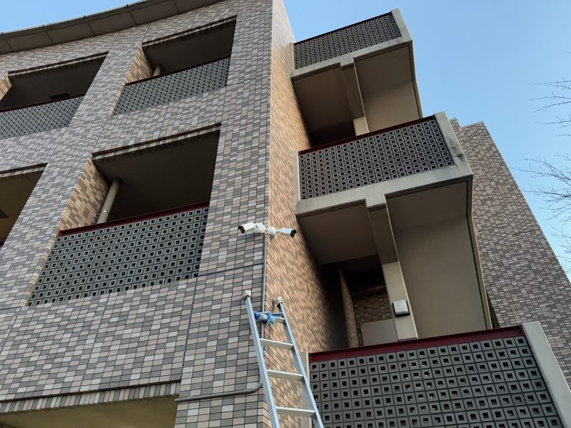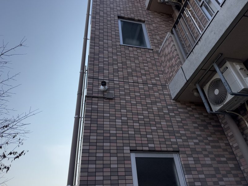 また、外壁のタイル調デザインに合わせて 配管やカメラの色味・取付位置も丁寧に調整し、建物の外観を損なわない仕上がりにしています。