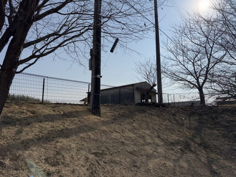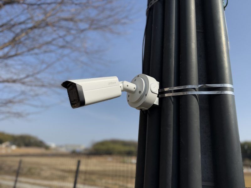 さらに敷地外周には、電柱を利用して1台を設置。広い敷地の外周部までしっかりと監視できるよう、見通しの良い位置を選定しました。カメラの取付にはステンレスバンドを使用し、確実な固定とスマートな見た目を両立しています。